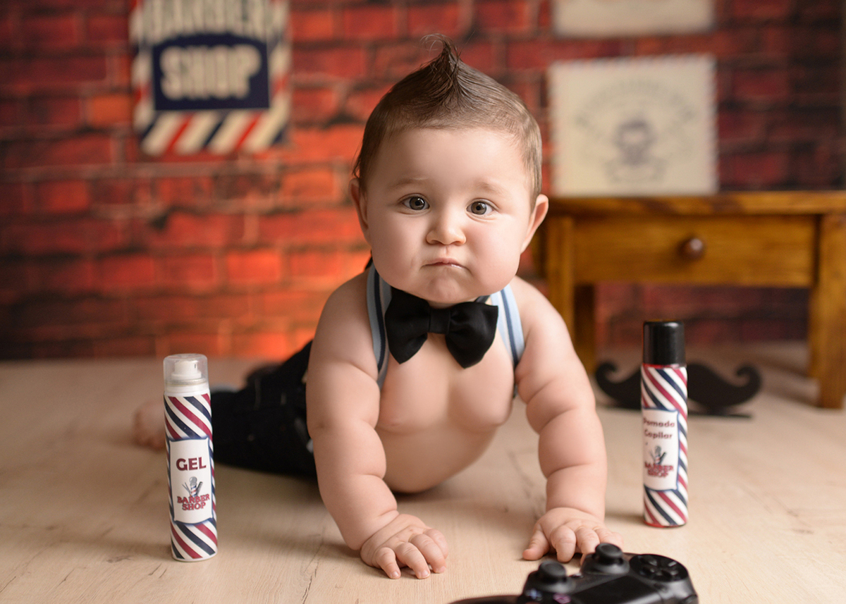E para o ensaio de acompanhamento mensal de 9 meses do Gu, o cenário escolhido foi de barber shop
