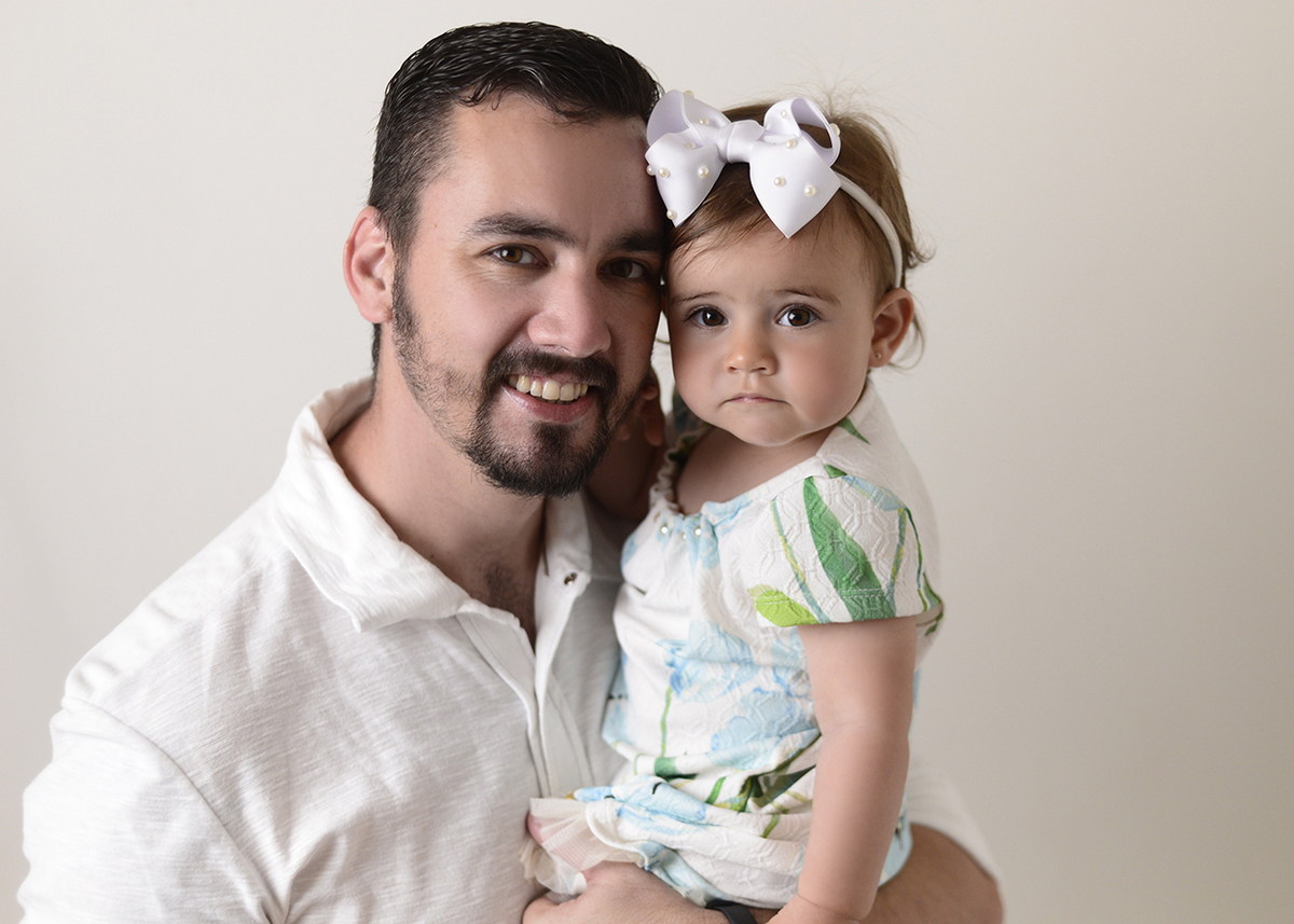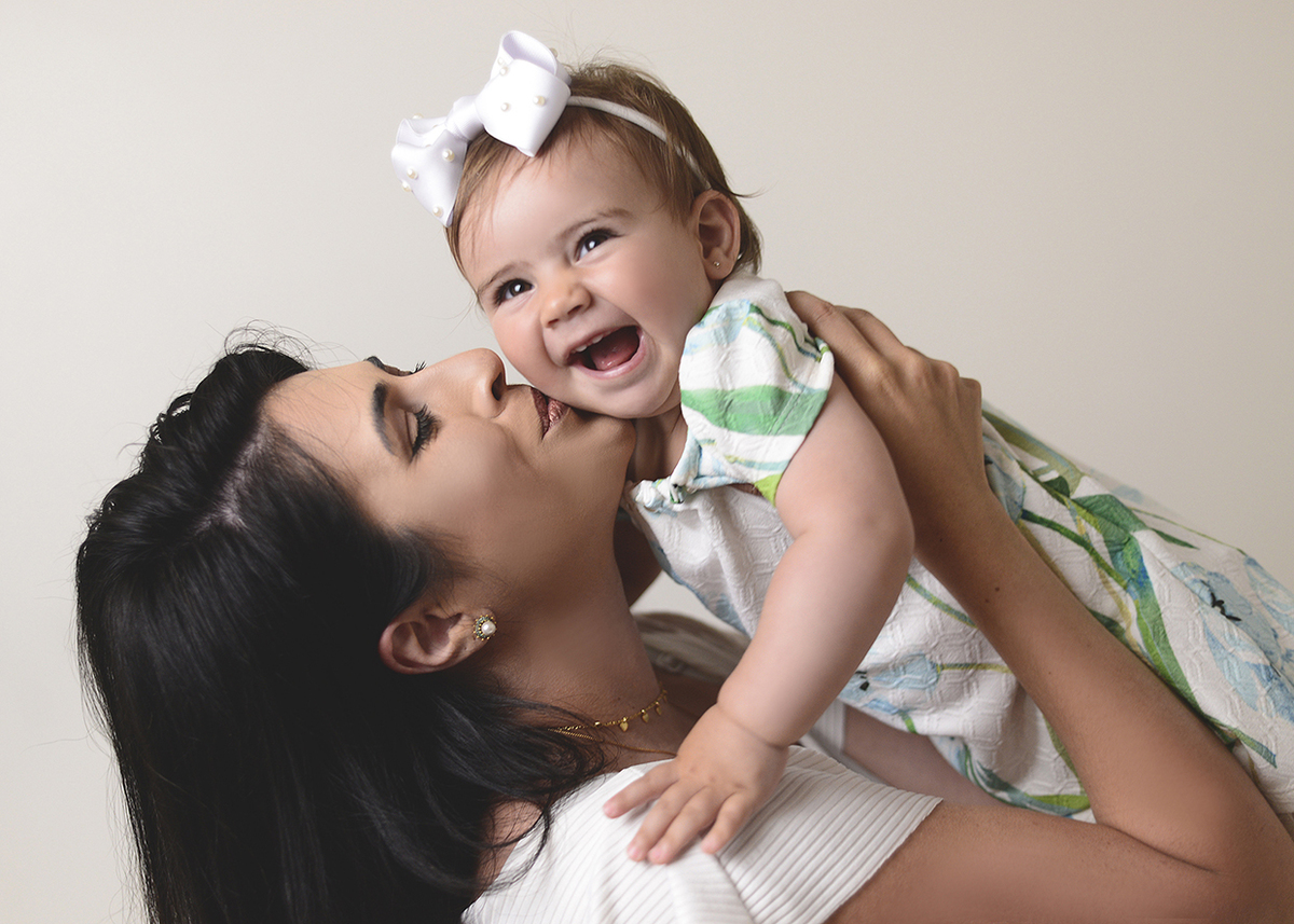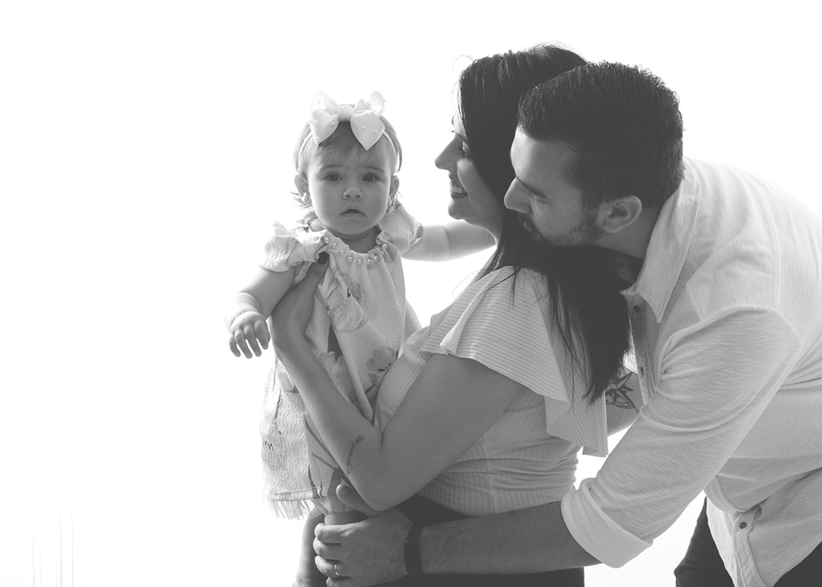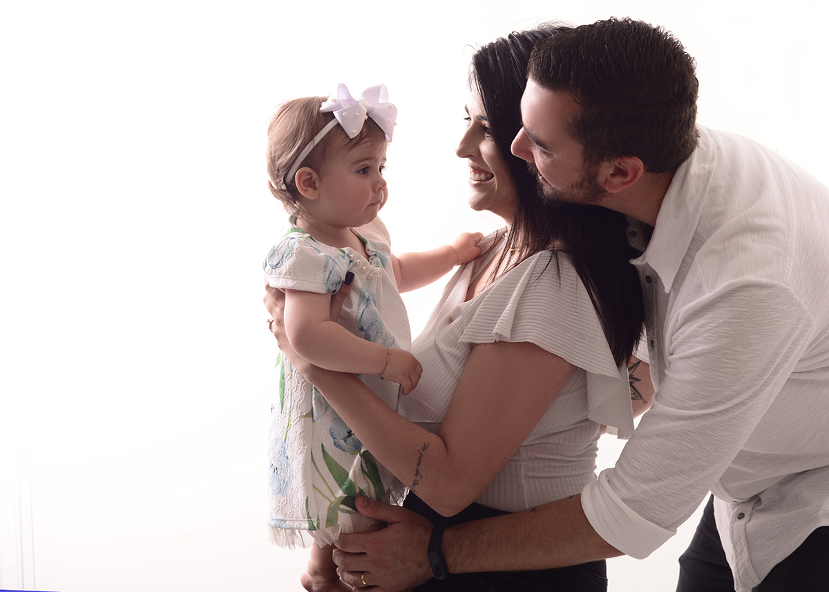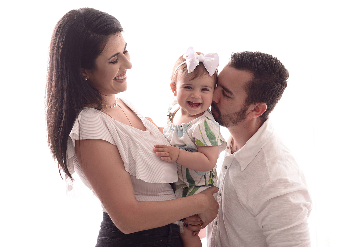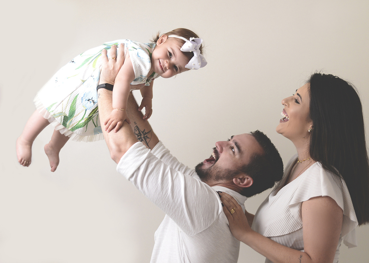 Para Família sugerimos um ensaio neutro, com fundo claro e roupas que combinem entre si. A proposta é brincar com o bebê enquanto fazemos os clicks, dar beijinhos e cheirinhos e assim conseguimos fotos bem descontraídas, e fica lindo