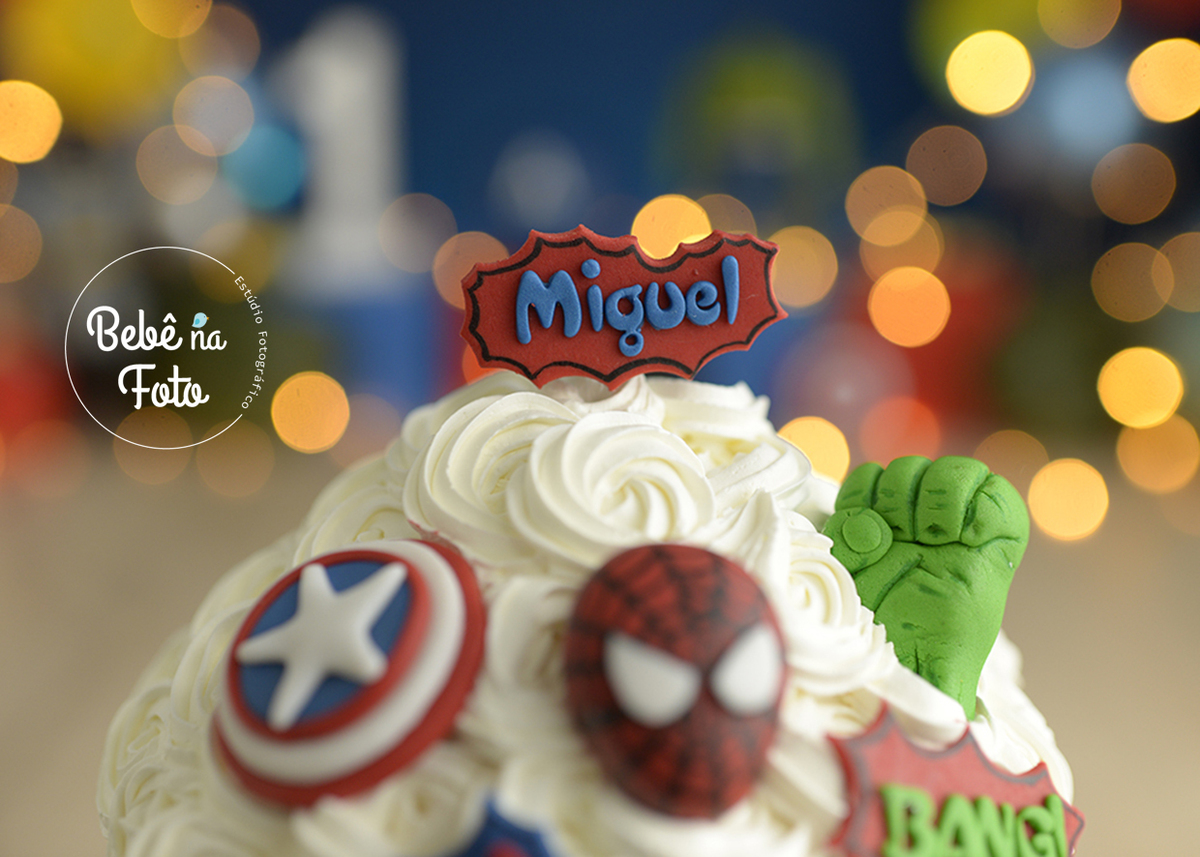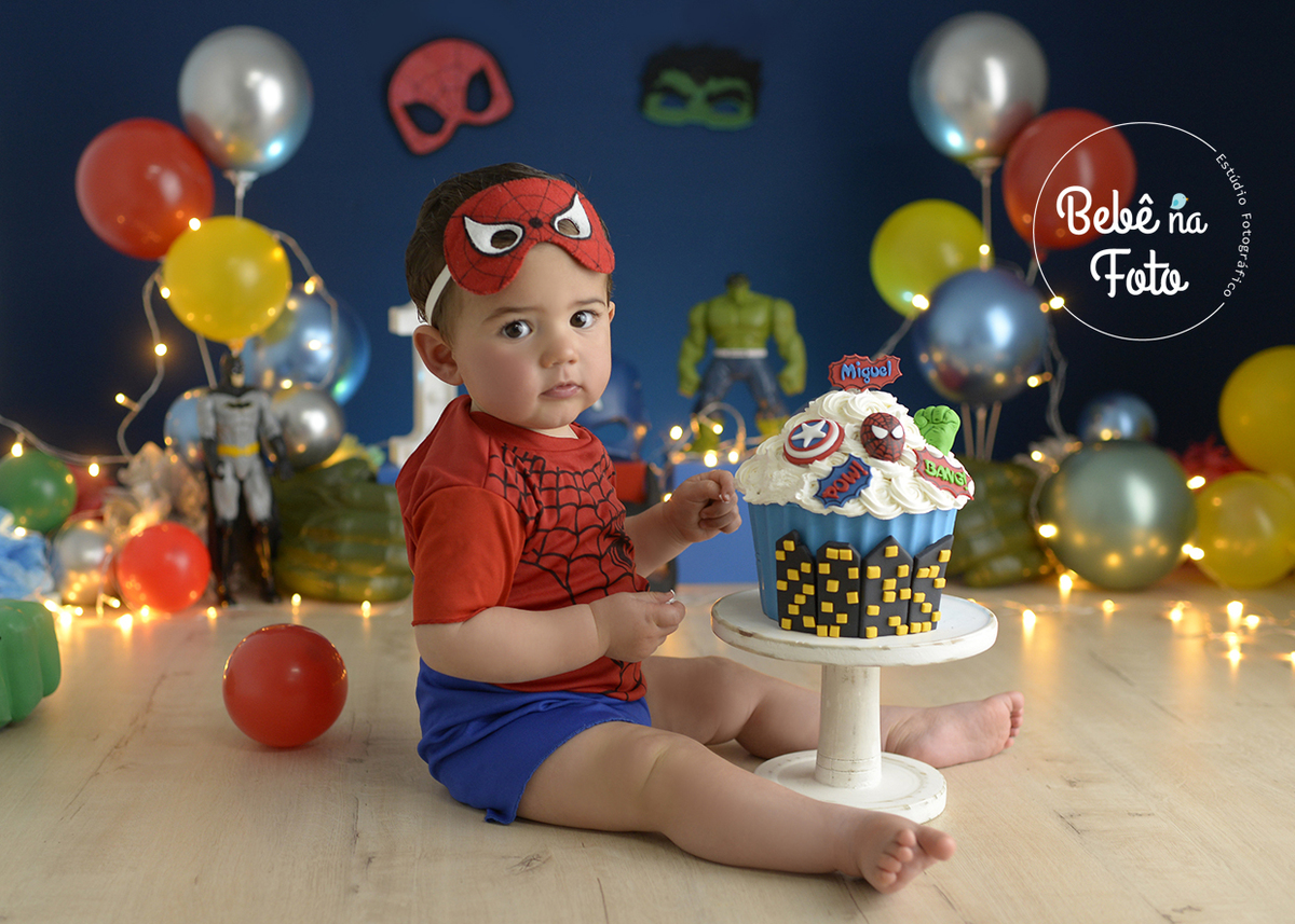 E para comemorar o 1º Aninho do Miguel a mamãe escolheu o tema de heróis para ensaio de smash the cake